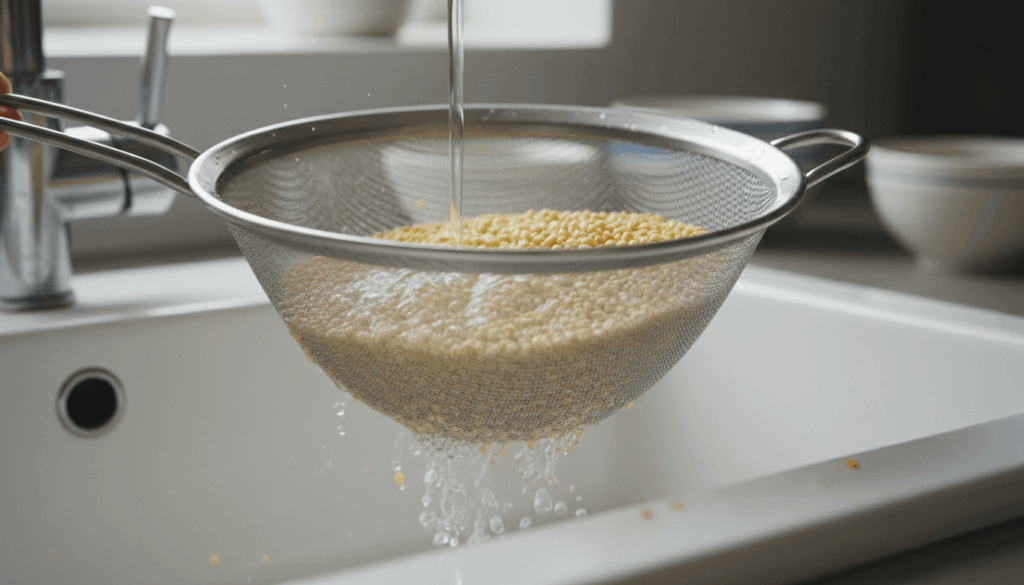 Nota importante: A diferencia de la quinoa, el fonio NO tiene saponinas amargas, así que un enjuague breve es suficiente. No necesitas remojar ni enjuagar varias veces.