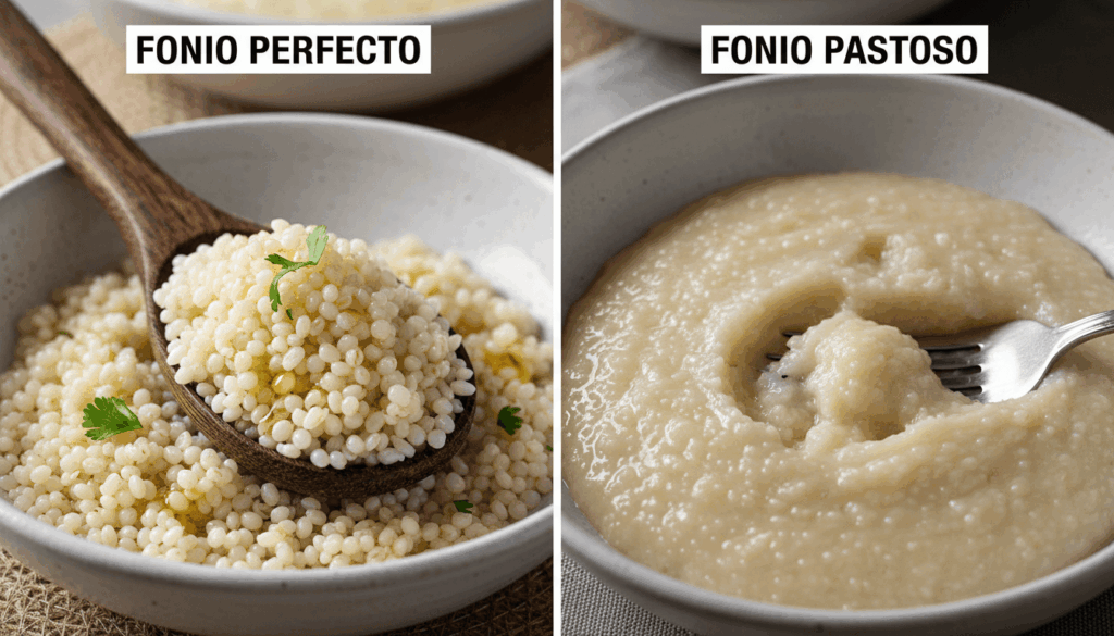 Textura perfecta: El fonio correctamente cocido debe parecer cuscús fino y esponjoso, no pastoso ni empapado.