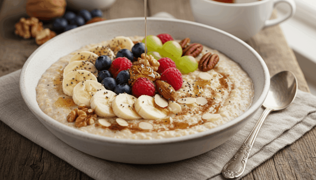 - Toppings: frutas frescas, frutos secos, semillas