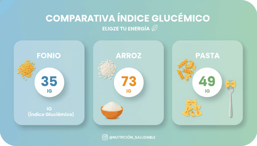 Conclusión de la tabla: El fonio combina lo mejor de todos los mundos: energía sostenida como la avena, digestión rápida como el arroz, y el índice glucémico más bajo de todos.