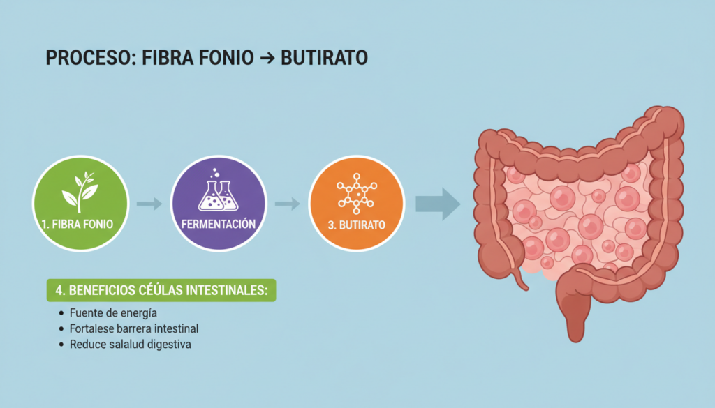 Sí, la fibra del fonio fermenta – ¡y esto es BUENO! La fermentación produce AGCCs (butirato, propionato, acetato) que nutren tu intestino. Es diferente de fermentación «mala» (que causa gases excesivos). La fermentación del fonio es moderada y controlada, produciendo metabolitos beneficiosos sin malestar.