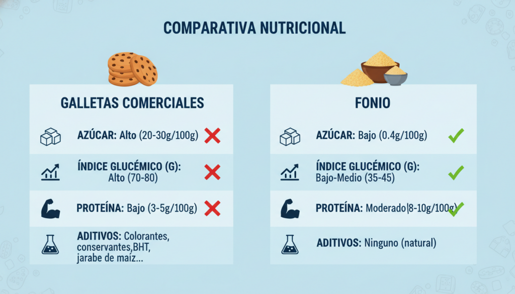 | Característica | Galletas Comerciales (Oreo, Príncipe) | Galletas Fonio Caseras | Ventaja |