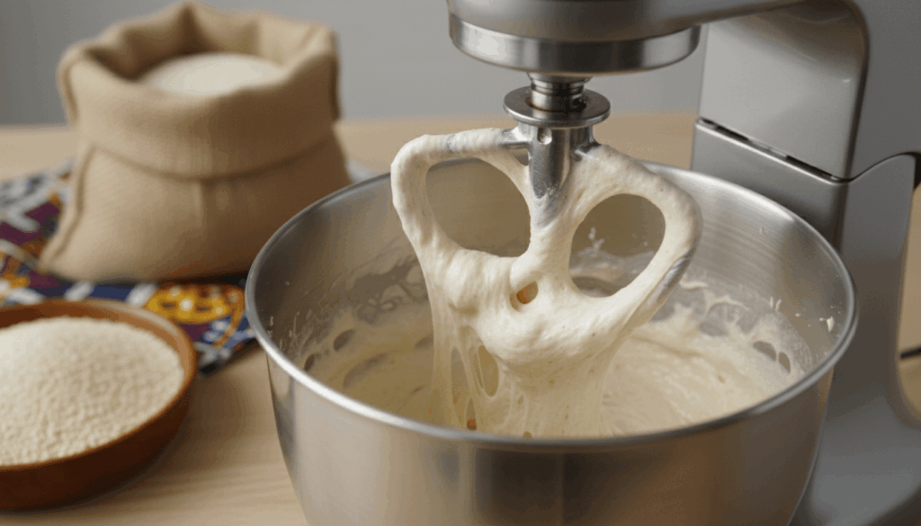 - Amasa (diferente a pan con gluten): Aumenta a velocidad media. «Amasa» durante 3-4 minutos continuos. A diferencia de masa con gluten, la masa de fonio será muy pegajosa y húmeda – esto es CORRECTO. No añadas más harina. La textura debe ser como mousse espesa o puré de papas suave.