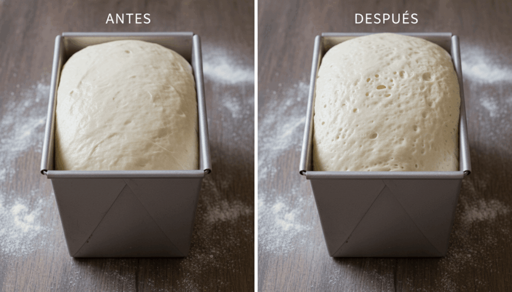 - Primera fermentación: Cubre el molde con paño de cocina húmedo (no papel film – necesita respirar). Coloca en lugar cálido (24-28°C ideal). Opciones: