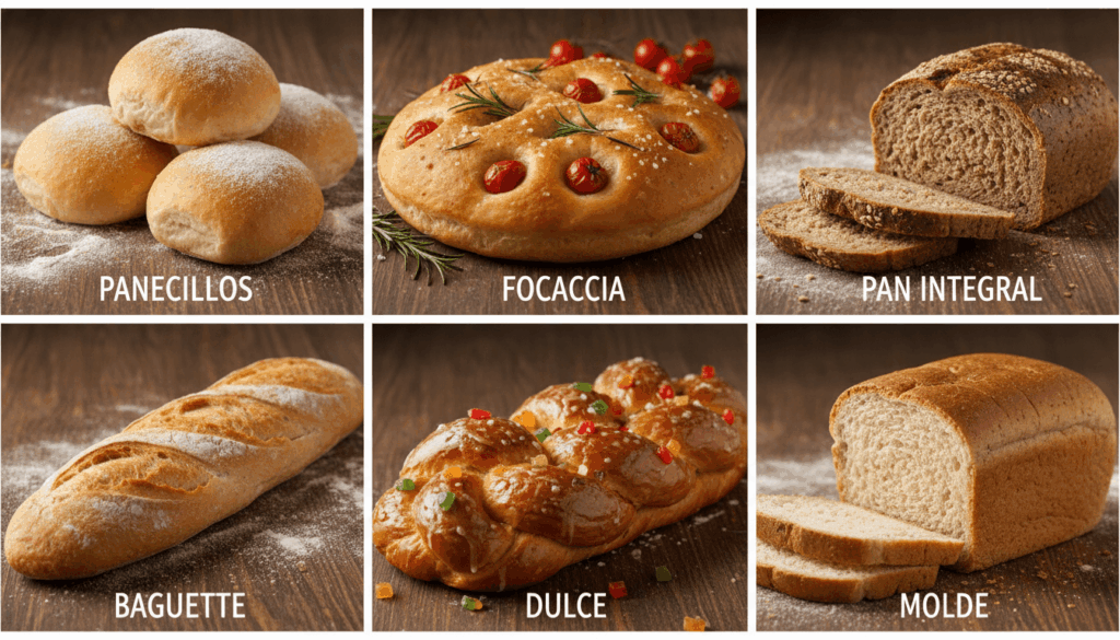 - ✅ 6 variaciones: baguette, panecillos, focaccia, pan dulce, pan integral, pan de molde